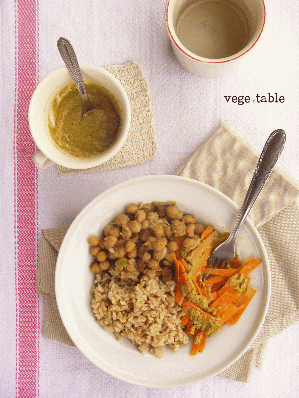 Per questo pranzo home-style ho voluto comporre anche un bel piattino...non proprio come le fantastiche bowl che si vedono su instagram, ma comunque invitante: ho abbinati i ceci spaziati a del riso integrale e delle carote crude condite con una salsa di pistacchi facile facile (ottenuto tritando pistacchi, qualche mandola, olio extravergine, un goccio d'acqua e un pizzico d'aglio in polvere).